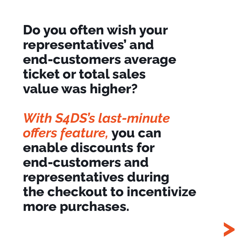 With S4DS’s last-minute offers feature, you can enable discounts for end-customers and representatives in the checkout step to make the buying journey on your digital channels resemble the experience they would obtain in a physical store: