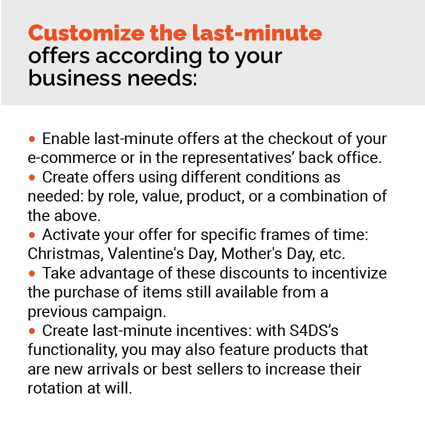 • Last-minute offers can be enabled both in the checkout of your e-commerce or within the order management system in the representatives’ back office.