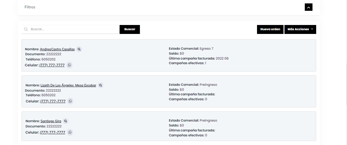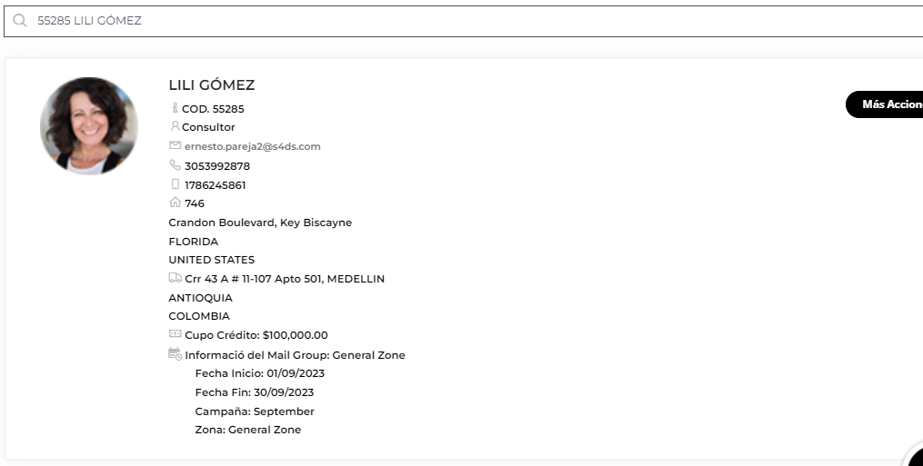 Al hacer clic en la lupa se muestra información de 360 grados sobre el usuario: