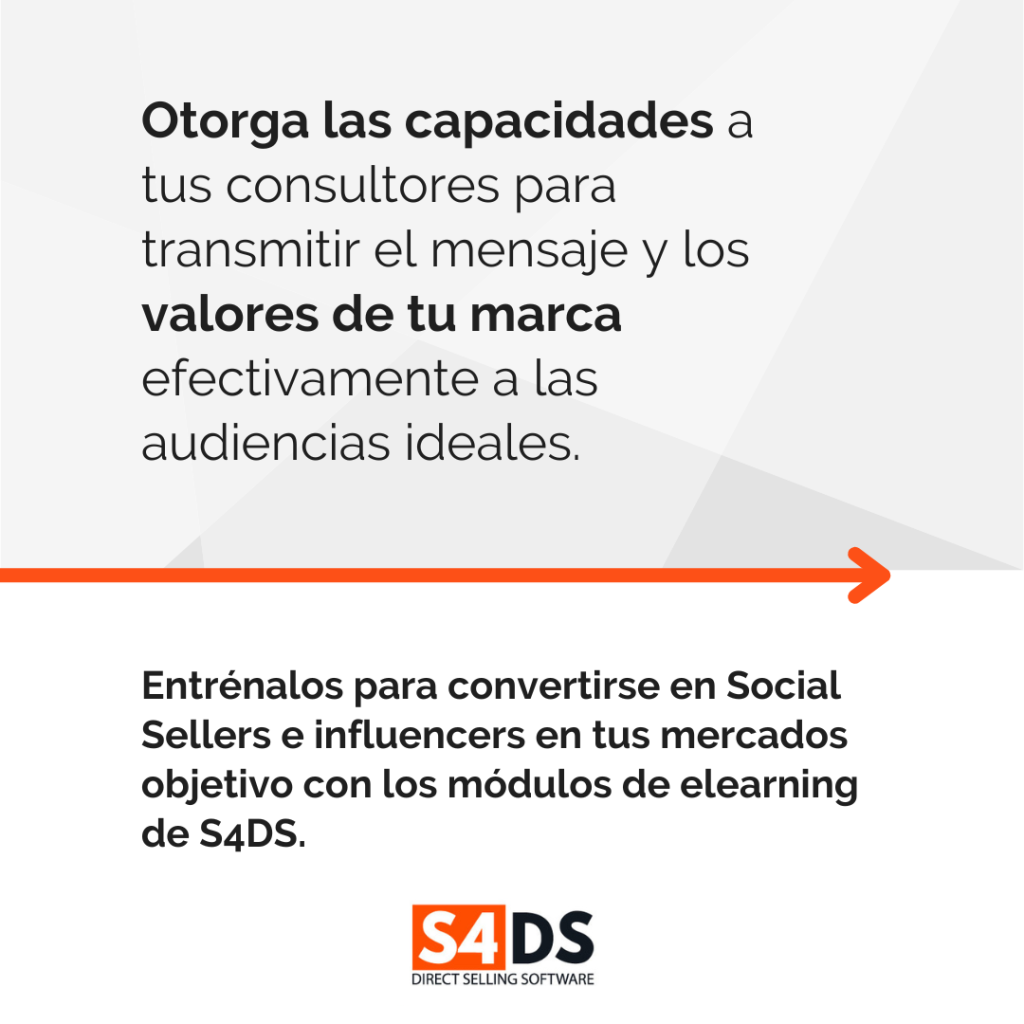 Entrena a tu equipo corporativo, representantes de ventas, distribuidores, afiliados e influencers en social selling (ventas sociales) con los módulos de entrenamiento de S4DS para apoyarlos y convertirlos en expertos en aprovechar el mensaje de tu negocio y llegar a las audiencias correctas para conectarse con sus valores mientras resaltan las ventajas del producto en su estilo de vida.